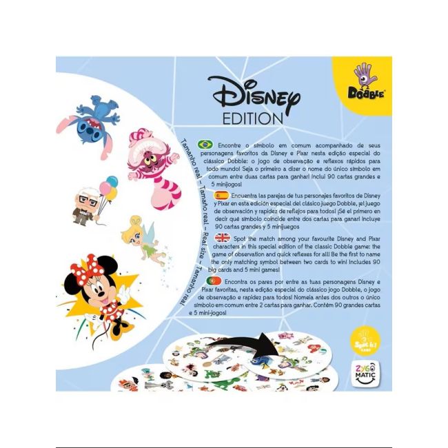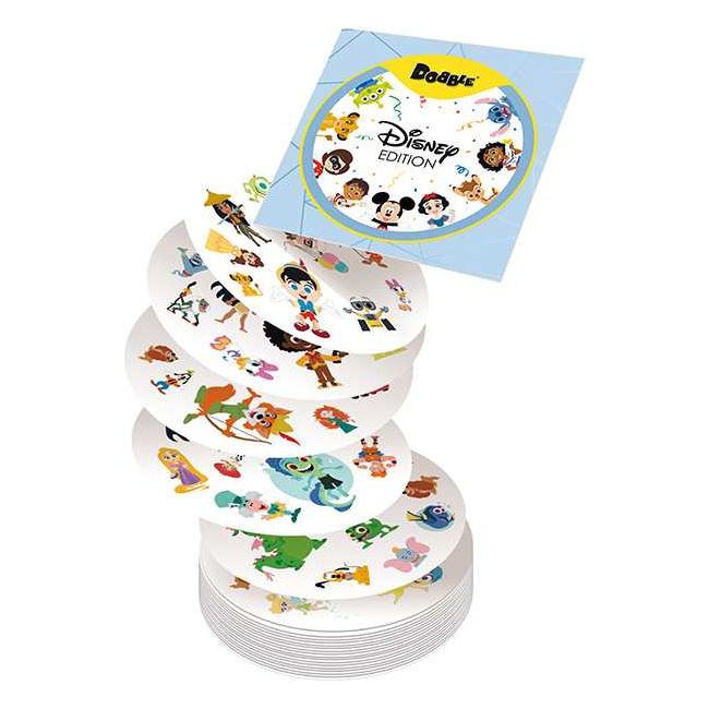 Spot the match among your favourite Disney and Pixar characters in this special edition of the classic Dobble game: the game of observation and quick reflexes for all! Be the first to name the only matching symbol between two cards to win!