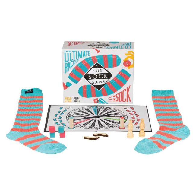 In The Sock Game, two teams compete to grab all the right items first — but it's going to be tough to find what you're looking for as each team has a large fluffy sock that has thirty tiny items stuffed inside it. On a turn, someone spins the spinner to see what the active players need to grab, then those people start digging. Whoever finds it first scores a point, and whichever team scores eleven points first wins (as long as they're beating the other team by at least two points).